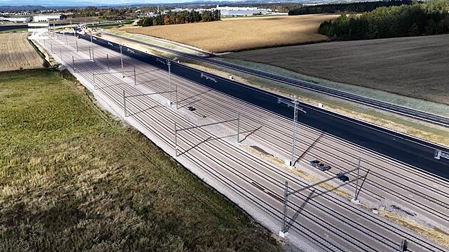 V hotovém úseku jsou už připraveny základy pro budoucí stožáry elektrické trakce. Troleje se však instalují až v závěrečné fázi prací v celém úseku.