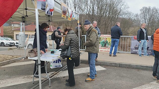 Organizátoři na hranici v Náchodě rozbalili stánek pro sběr podpisů na podporu evropské občanské iniciativy Stop falšovaným potravinám. (27. února 2025)