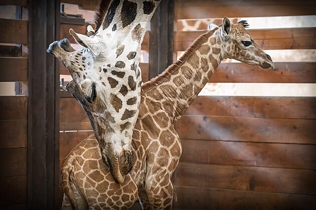 Mládě žirafy Rothschildovy den po narození (26. srpna 2025)
