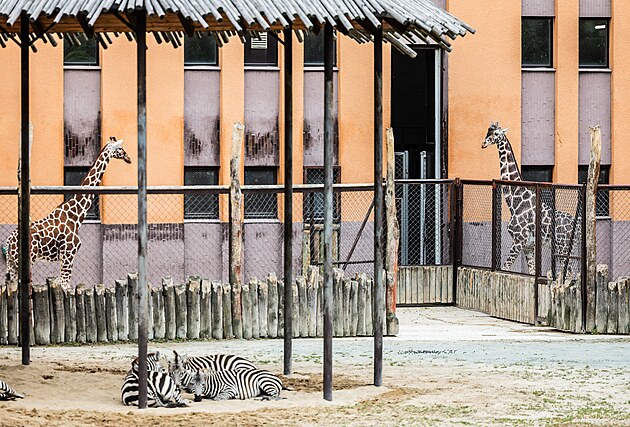 Žirafy a zebry v dvorském Safari parku. (9. července 2025)
