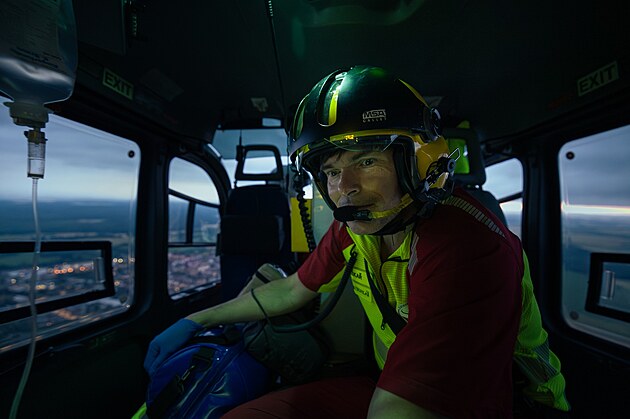 Lékař Anatolij Truhlář ve vrtulníku doprovází pobodaného muže do hradecké nemocnice. (3. července 2025)