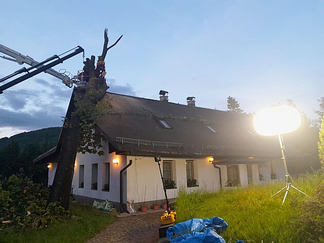 Bouře vyvrátila strom, který spadl na dům. (28. května 2025)