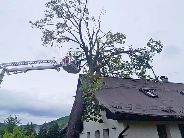 Bouře vyvrátila strom, který spadl na dům. (28. května 2025)