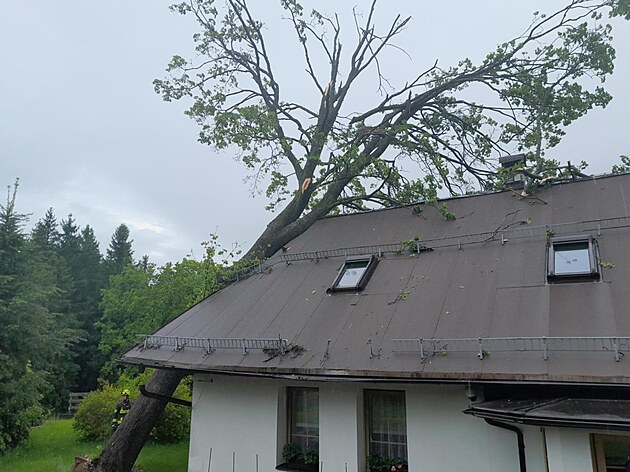 Bouře vyvrátila strom, který spadl na dům. (28. května 2025)