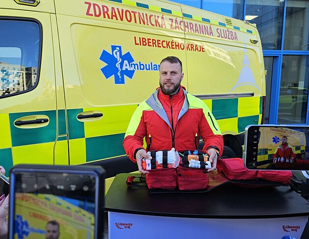 Pohotovostní brašna Panic obsahuje základní vybavení pro zástavu masivního krvácení. Na snímku mluvčí záchranářů Michael Georgiev.