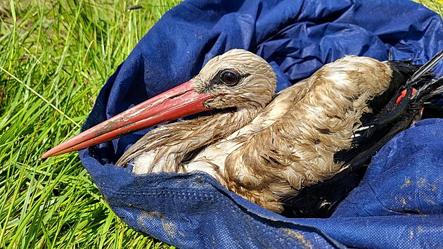 Čáp uvázl v odpadní jímce. (12. června 2025)