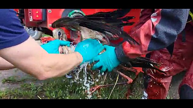 Čáp uvázl v odpadní jímce, hasiči ho omyli