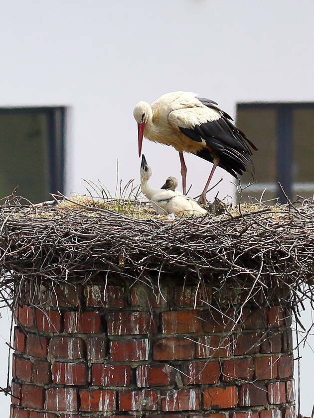 Čáp bílý s mláďaty na komíně zahradnictví v centru Zlína (jaro 2024)