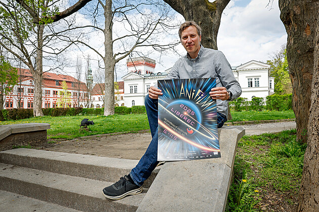 Ředitel festivalu Anifilm Tomáš Rychecký před libereckým zámkem, který je centrem dění. (23. dubna 2025)