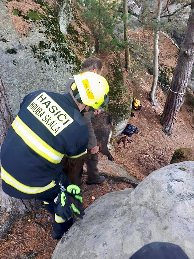 Do pasti na skalní věži se dostala rodina divokých prasat.