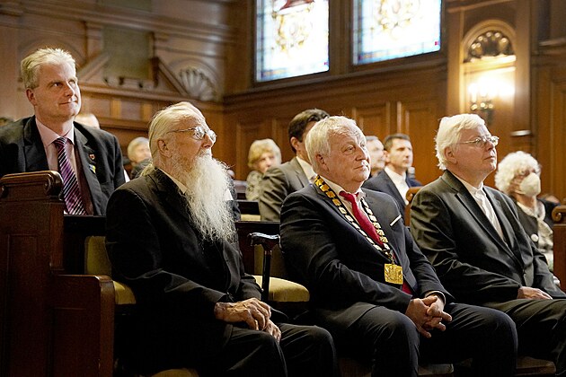 Fotograf Václav Toužimský (s brýlemi vlevo) dostal v roce 2022 za svou práci ocenění v podobě Medaile města Liberec. Na snímku vedle něj je tehdejší primátor města Jaroslav Zámečník.