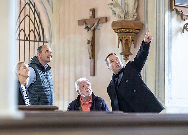 Kostel v Zákupech zdobí nové lustry. Na jejich výrobu přispěl i herec Jaromír Hanzlík (druhý zprava). (10. května 2025)