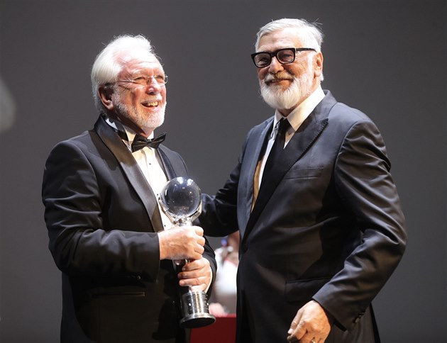 Dojatý Jaromír Hanzlík přebírá ocenění za přínos českému filmu od Jiřího Bartošky (7. července 2018).
