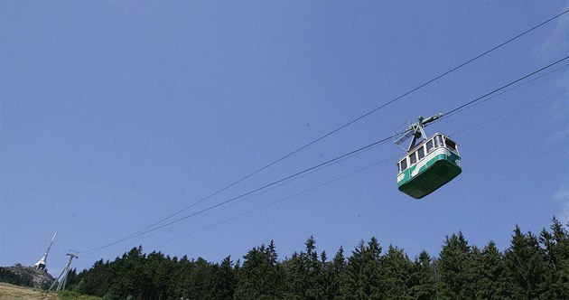 Lanovka na Ještěd. Kabina lanovky uveze 35 lidí a překoná převýšení přes 400 metrů.
