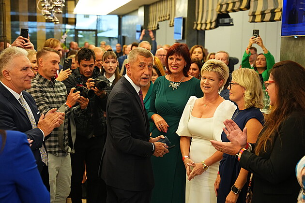 Ve volebním štábu hnutí ANO na Chodově se začíná slavit vítězství v parlamentních volbách 2025 do Poslanecké sněmovny. (4. října 2025)