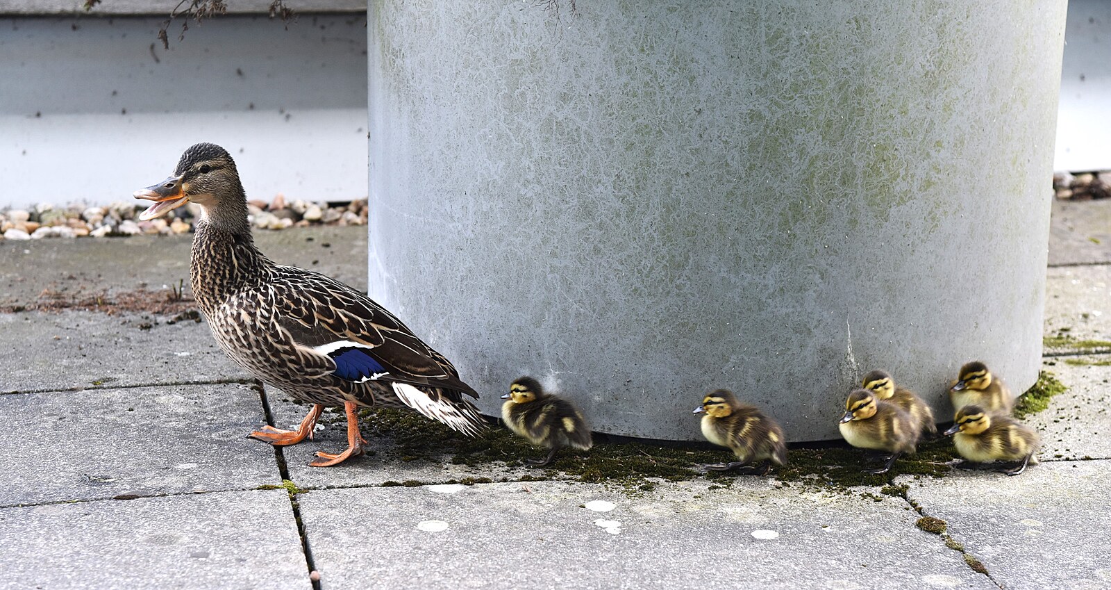 Kachna zahnízdila v truhlíku na okrasné dřeviny před zhruba 20 dny. Celkem snesla devět vajíček, ze kterých se vyklubalo devět kachňátek. Ta musela nejdřív seskočit za mámou. Pak se rodinka promenádovala po terase a bylo potřeba je odchytit.