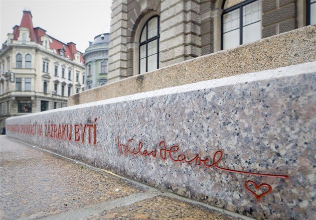 Neobvyklý památník je zasazen přímo mezi schody historické radnice.