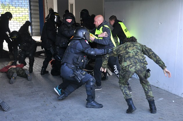 Těžkooděnci ve stísněných podmínkách stadionu cvičili zásah proti rozdováděným rowdies.
