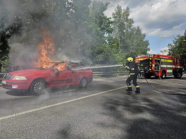 V Liberci v ulici Letná došlo k požáru auta, řidička z něj stihla vyskočit. (14. července 2025)