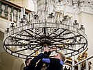 Velmi těžký a křehký. Impozantní lustr z poutního kostela Navštívení Panny Marie v Hejnicích na Liberecku míří po 103 letech na generální obnovu. Téměř pět metrů vysoké a tři metry široké dílo z olovnatého křišťálu ve středu dopoledne z lešení opatrně sejmuli pracovníci sklářské firmy Preciosa Lighting, která v následujících měsících zajistí jeho odborné repasování.