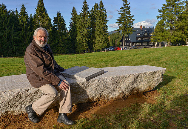 Lavičku si však oslavenec domů odnést nemůže, leda že by si zapůjčil jeřáb. Posezení zhotovené z jednoho kusu žulového balvanu měří přes šest metrů a váží přibližně pět tun. Sedací část krášlí otevřená kamenná kniha coby pocta autorovi až legendárních knih.