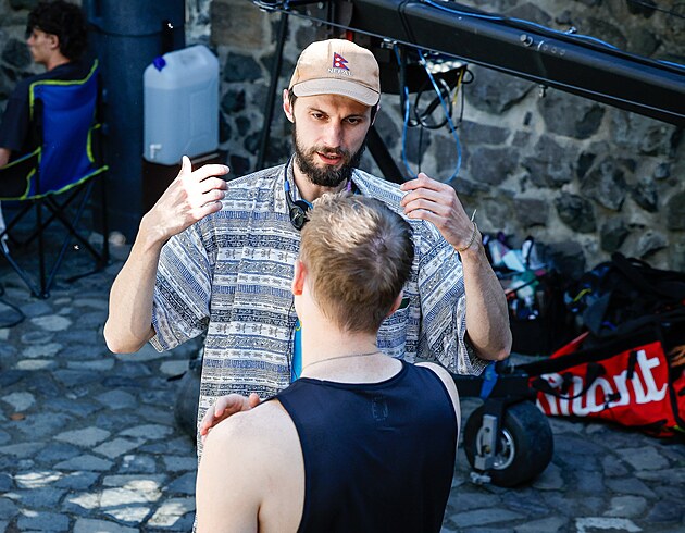Režisér Adam Koloman Rybanský uděluje pokyny Adamu Mišíkovi. (1. září 2025)