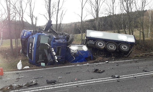 Řidič kamionu byl se středně těžkým poraněním transportován na traumacentrum liberecké nemocnice.
