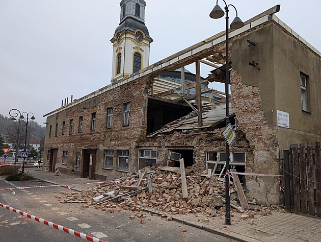 V Novém Boru na Českolipsku se částečně zřítila nejstarší budova, bývalá restaurace Pošta. (7. 11. 2024)