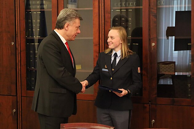 Ministr spravedlnosti Pavel Blažek a generální ředitel vězeňské služby Simon Michailidis ocenili medailí za statečnost pprap. Lenku Ševčíkovou. Příslušnice zachránila 29. 12. 2024 ve Stráži pod Ralskem život dvouletému dítěti.