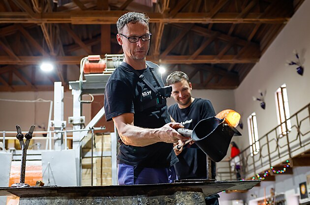 Ve sklárně Ajeto na Českolipsku skláři vyrábějí zhruba dvě stě křišťálových sloupců. (22. května 2025)