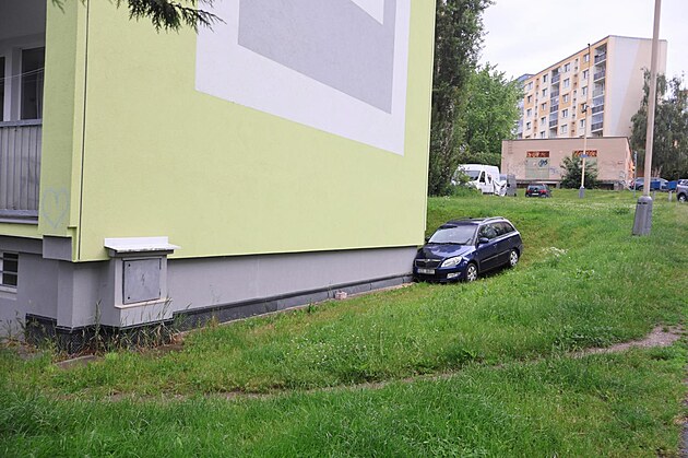 Několik metrů ujela v pátek 6. června na sídlišti Špičák v České Lípě nezabrzděná fabie, než narazila do panelového domu.