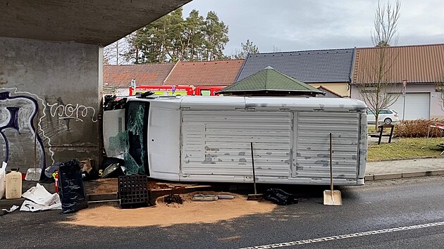 Řidič při nárazu do mostu převrátil dodávku na bok