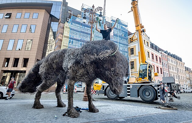 Stěhování sochy Vulpes od Františka Skály pryč z náměstí před libereckou radnicí (14. srpna 2025)