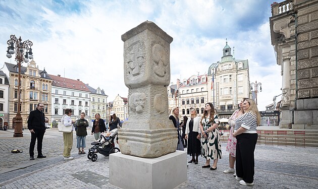 Nová instalace morového sloupu „Mezník“ od sochaře Jiřího Seiferta před libereckou radnici na náměstí Dr. E. Beneše. (21. srpna 2025)