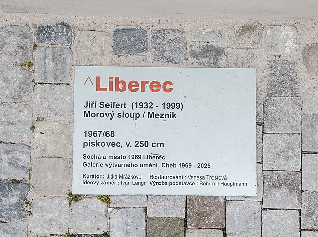 Nová instalace morového sloupu „Mezník“ od sochaře Jiřího Seiferta před libereckou radnici na náměstí Dr. E. Beneše. (21. srpna 2025)