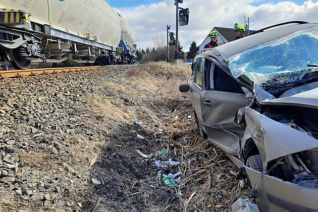 Škoda Octavia po střetu s vlakem na Českolipsku, kde mladík jen se štěstím vyvázl s lehkými zraněními. (17. března 2025)