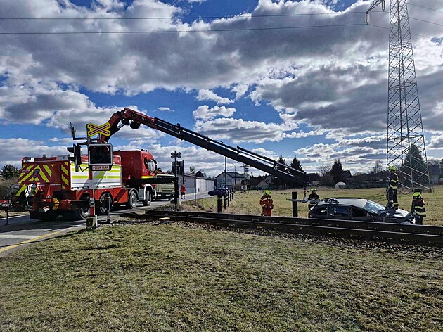 Zásah hasičského sboru na místě nehody, Škoda Octavia v příkopu vedle kolejí. (17. března 2025)