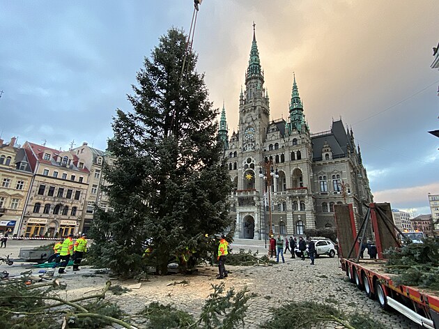 Náměstí před libereckou radnicí zdobí vánoční jedle. Doputovala sem z Dolního Hanychova. (16. listopadu 2024)