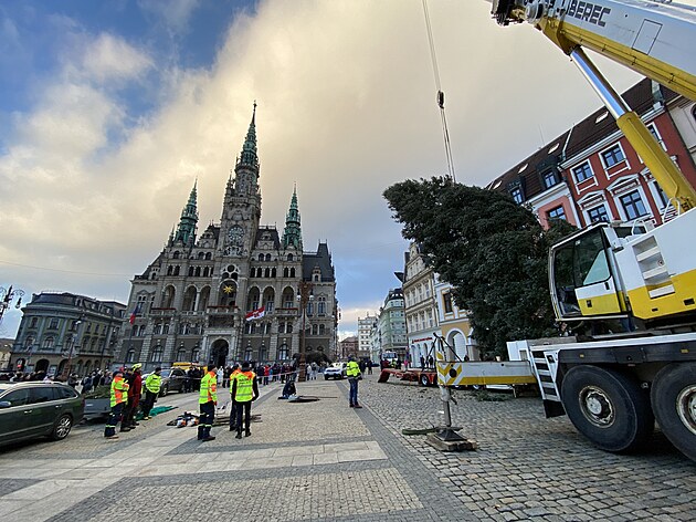 Náměstí před libereckou radnicí zdobí vánoční jedle. Doputovala sem z Dolního Hanychova. (16. listopadu 2024)