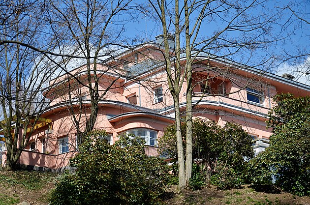 Strossova vila zaujme lososovou barvou, původně byla cihlová.