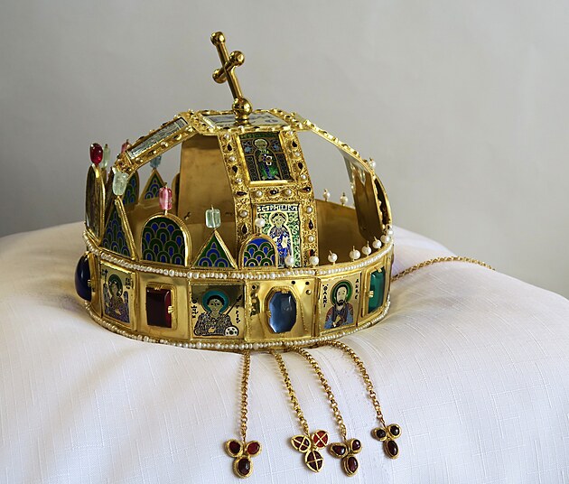 Kopii Svatoštěpánské koruny vytvořil Jiří Urban, z jeho dílny pochází i další repliky korunovačních klenotů.