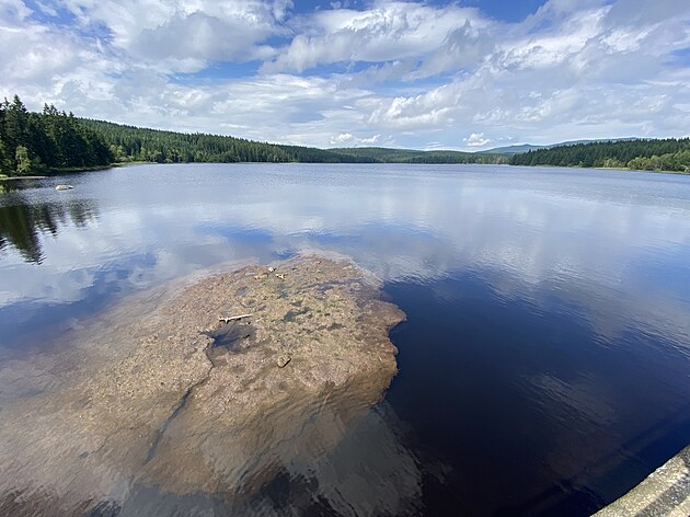 Turisty překvapil „tajemný ostrov“ plující po hladině přehrady na Černé Nise. (13. července 2025)