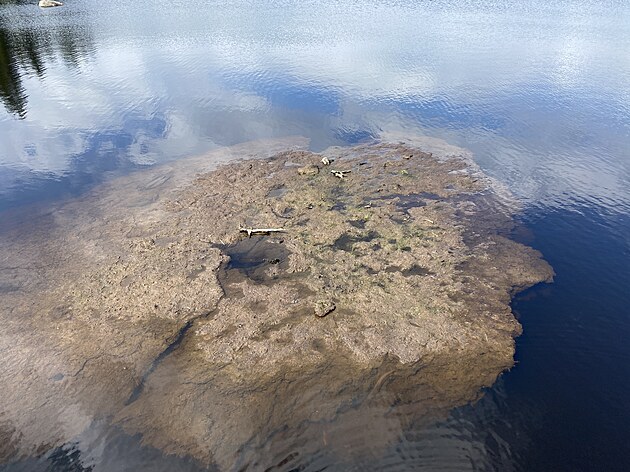 Turisty překvapil „tajemný ostrov“ plující po hladině přehrady na Černé Nise. (13. července 2025)