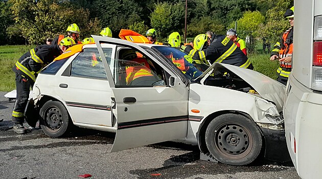 Hasiči v Libereckém kraji zasahovali u dopravní nehody dvou osobních automobilů a autobusu v Tatobitech na Semilsku. (16. září 2025)