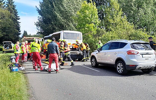 Hasiči v Libereckém kraji zasahovali u dopravní nehody dvou osobních automobilů a autobusu v Tatobitech na Semilsku. (16. září 2025)