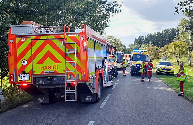 Hasiči v Libereckém kraji zasahovali u dopravní nehody dvou osobních automobilů a autobusu v Tatobitech na Semilsku. (16. září 2025)