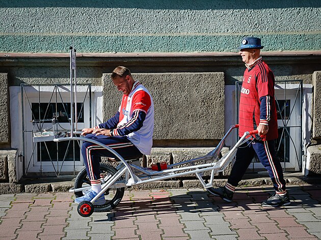 Akce Trakařem na derby navazuje na 60 let starou sázku sparťana a slávisty. (Smržovka, 28. září 2025)