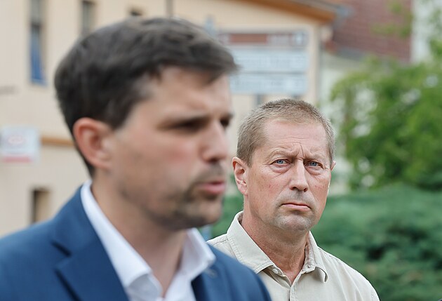 Ministr životního prostředí Petr Hladík (vlevo) na setkání s novináři v Dubé. (15. července 2025)