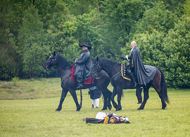 Na louce za Frýdlantem se císařské vojsko v čele s Albrechtem z Valdštejna (na koni vpravo) postavilo Švédům. (18. května 2025)
