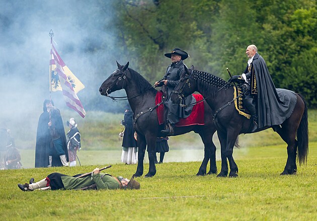 Na louce za Frýdlantem se císařské vojsko v čele s Albrechtem z Valdštejna (na koni vpravo) postavilo Švédům. (18. května 2025)